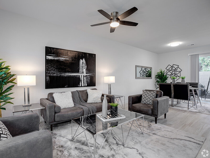 The living area offers a cozy retreat with luxury flooring and a sliding glass door that opens onto a private patio—an ideal spot to savor your morning coffee or take in the spectacular Arizona sunsets.
